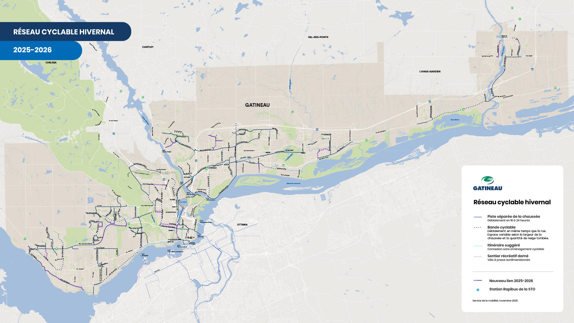 Pour l'hiver 2025-2026, c'est un peu plus de 13 km de sentiers supplémentaires qui seront déneigés. Avec l'optimisation des parcours de déneigement et avec la connexion à d'autres voies cyclables qui étaient déjà déneigées, notre réseau cyclable hivernal fera 18 km de plus que l'an dernier.