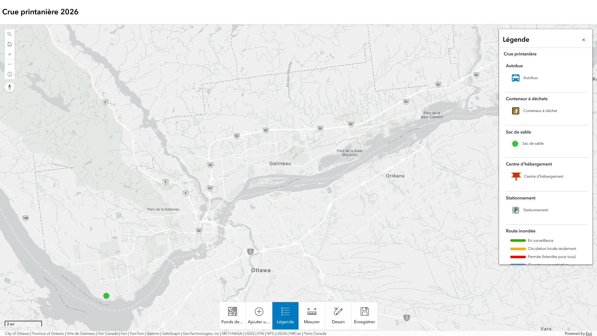 Cette carte affiche en temps réel le statut des rues, les stationnements offerts aux riverains, les zones susceptibles d'être touchées et les sites de distribution de sacs de sable.