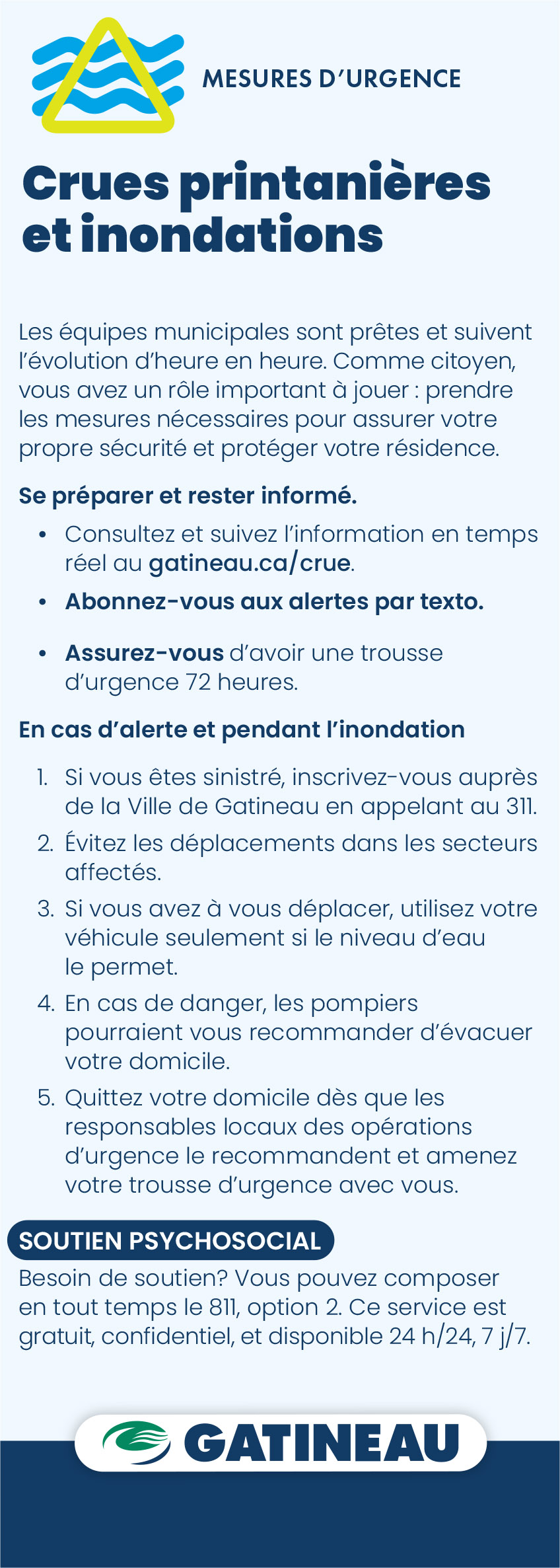 La crue printanière est un phénomène récurrent qui cause généralement peu de débordements. Comme chaque année, la Ville de Gatineau surveille de près la crue printanière. Les services municipaux sont prêts et les mécanismes sont en place pour anticiper et intervenir rapidement au besoin.