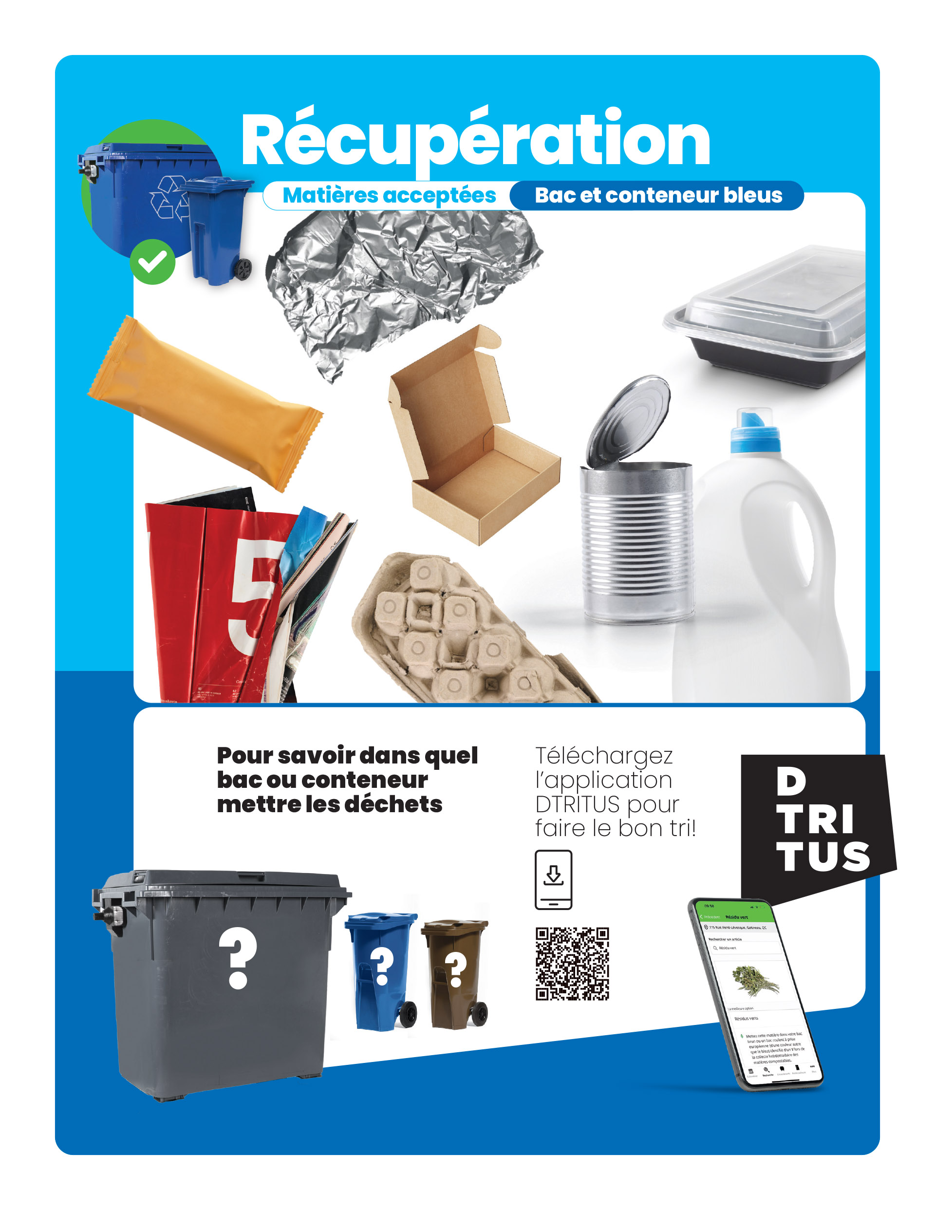 Si vous souhaitez acquérir, à vos frais, des contenants différents de ceux offerts, communiquez au préalable avec le Service de l'eau et des matières résiduelles à l'adresse pgmr@gatineau.ca pour vous assurer qu'ils sont approuvés par la Ville de Gatineau..