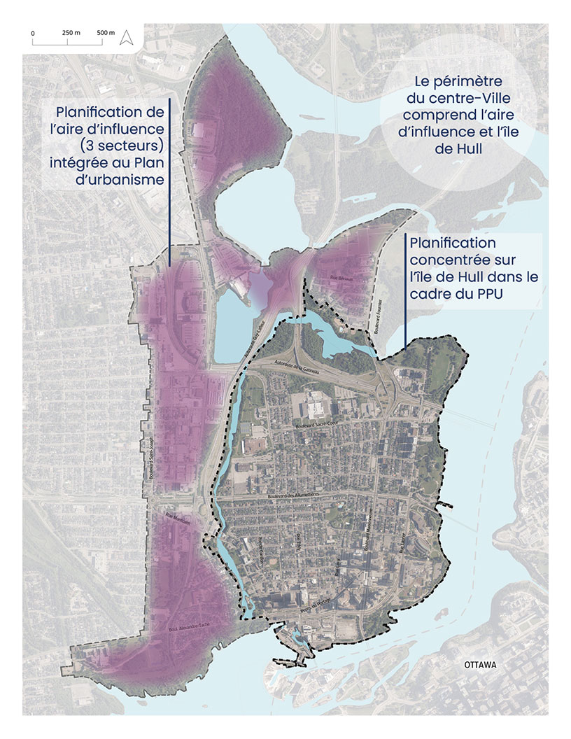 Le territoire assujetti au PPU actuel, adopté en 2010, comprend l'île de Hull, le secteur Fournier, le secteur du lac Leamy et du casino, le corridor du boulevard Saint-Joseph, l'Université du Québec en Outaouais (UQO) et le secteur du village d'Argentine.