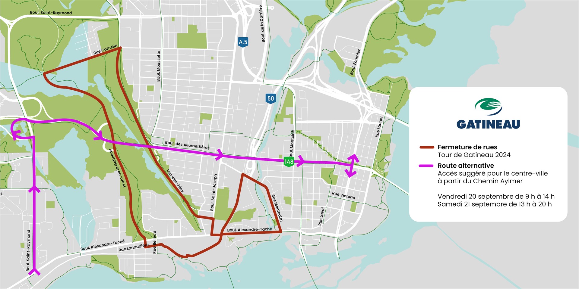 Gatineau, le 17 septembre 2024. – Le Tour de Gatineau se tiendra du 20 au 22 septembre prochains, dans le secteur de Hull. Des modifications à la circulation et au stationnement sont à prévoir en marge de cet événement.