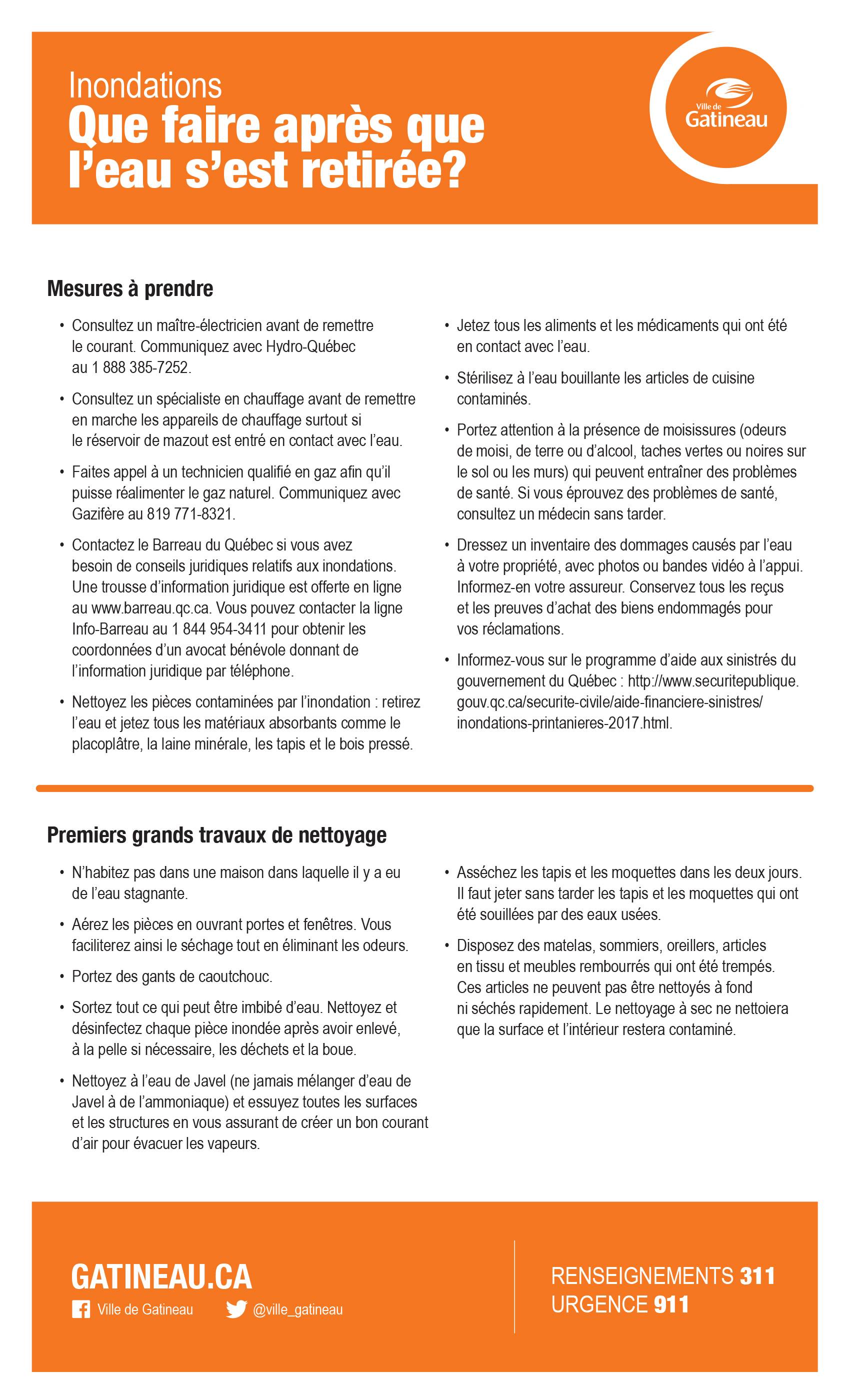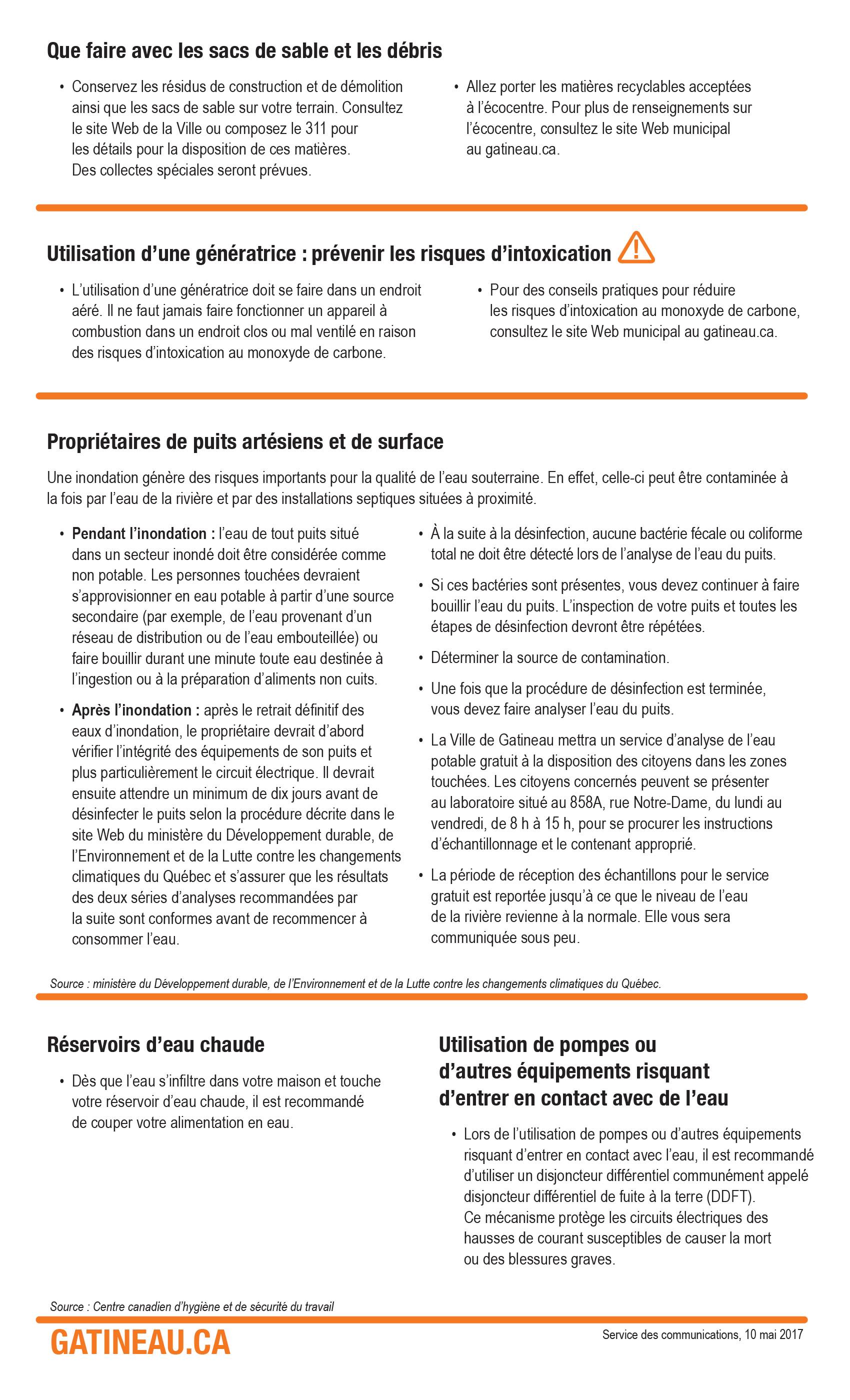 De nombreux conseils sont publiés dans le site Web de la Ville, dont : o Services offerts aux personnes évacuées o Quoi faire une fois que l'eau s'est retirée o Quoi faire avec les sacs de sable et les débris o Refoulement d'égout o Premiers grands travaux de nettoyage