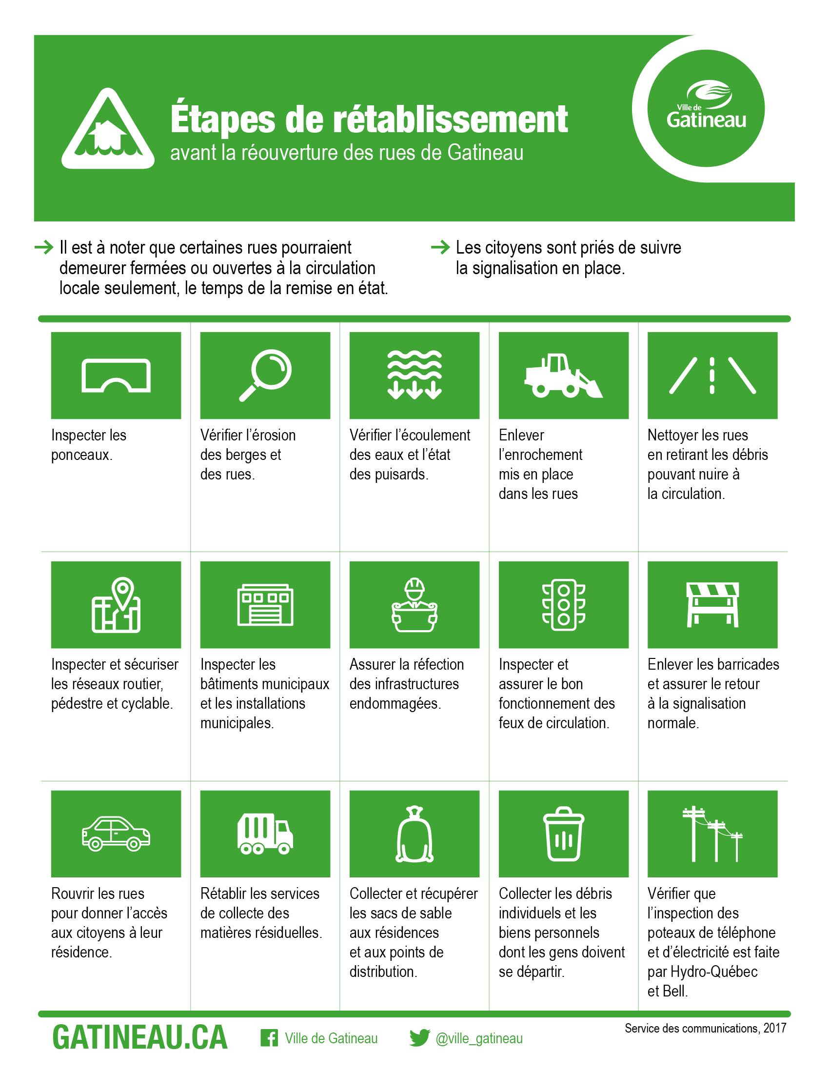 Il est à noter que certaines rues pourraient demeurer fermées ou ouvertes à la circulation locale seulement, le temps de la remise en état. Par exemple : o la Ville doit vérifier l'érosion et l'état de la chaussée; o retirer les débris ; o sécuriser le réseau.