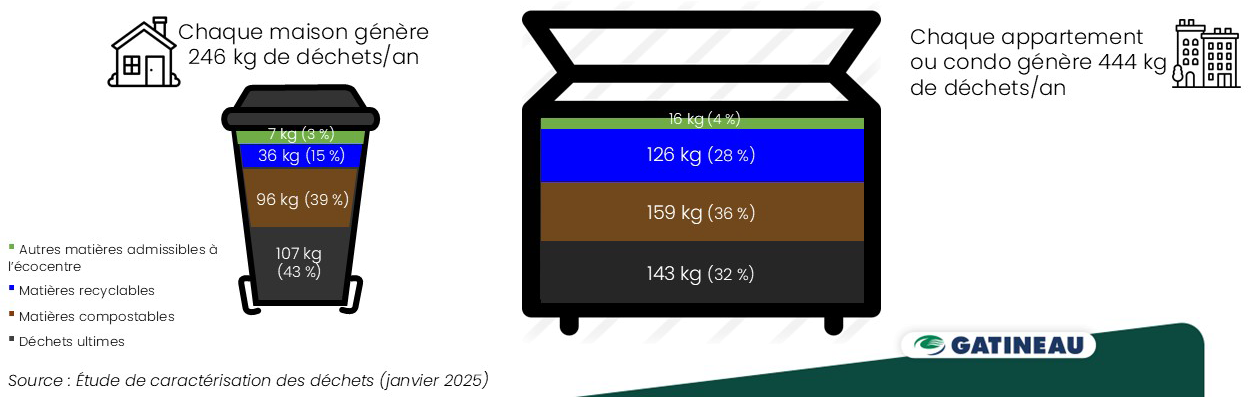 En moyenne, un appartement ou condo produit 444 kg de déchets par année, comparativement à 246 kg pour une maison unifamiliale.